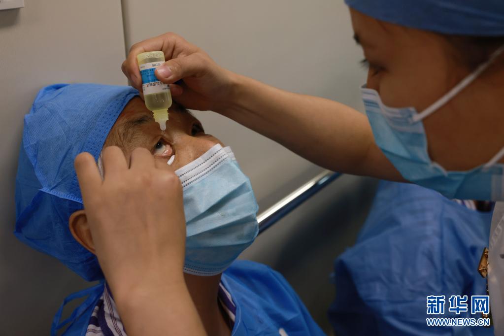 护士为李桂芳的眼睛滴入麻药,准备手术(6月17日摄)。