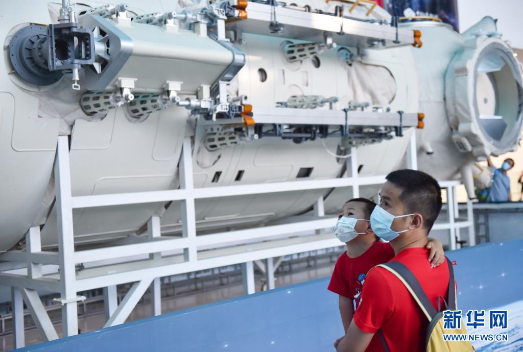 6月19日,一名家长带着孩子来到位于北京市朝阳区的中国科学技术馆,参观“天和核心舱”结构验证件实物,了解中国空间站相关知识。新华社记者 陈钟昊 摄