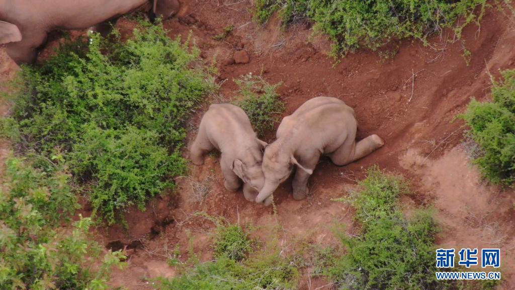 6月17日在玉溪市易门县十街乡拍摄的小象嬉戏打闹瞬间(无人机视频截图)。