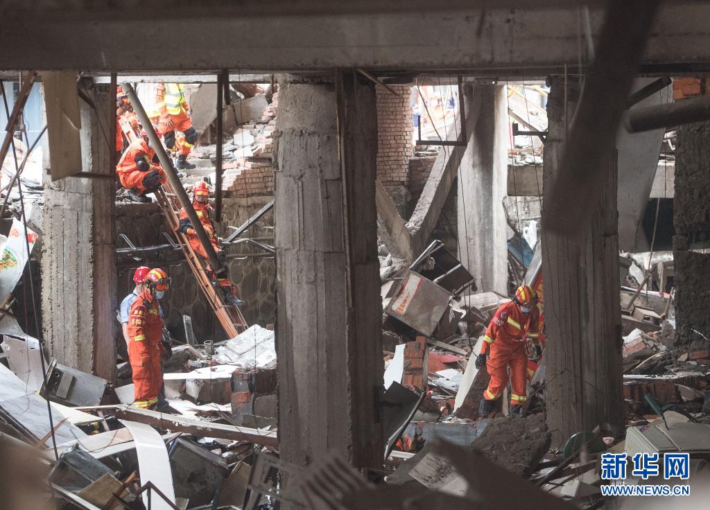 6月13日6时40分许,湖北十堰市张湾区艳湖社区集贸市场发生燃气爆炸。这是消防救援人员在现场搜救(6月13日摄)。