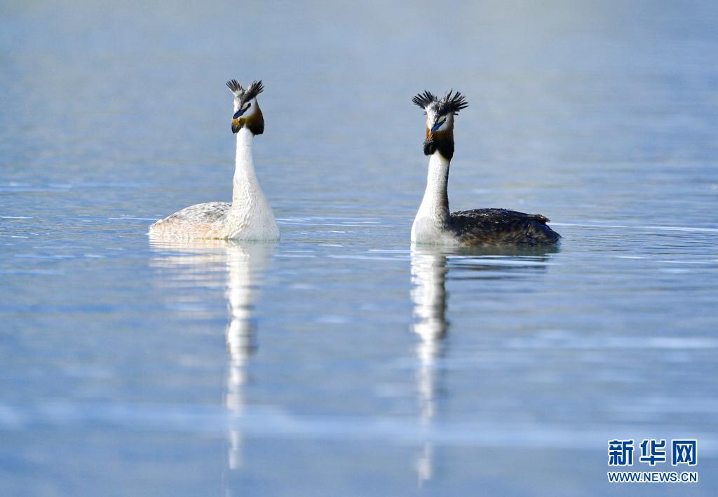 6月14日在西藏拉萨拉鲁湿地拍摄的两只凤头䴙䴘。
