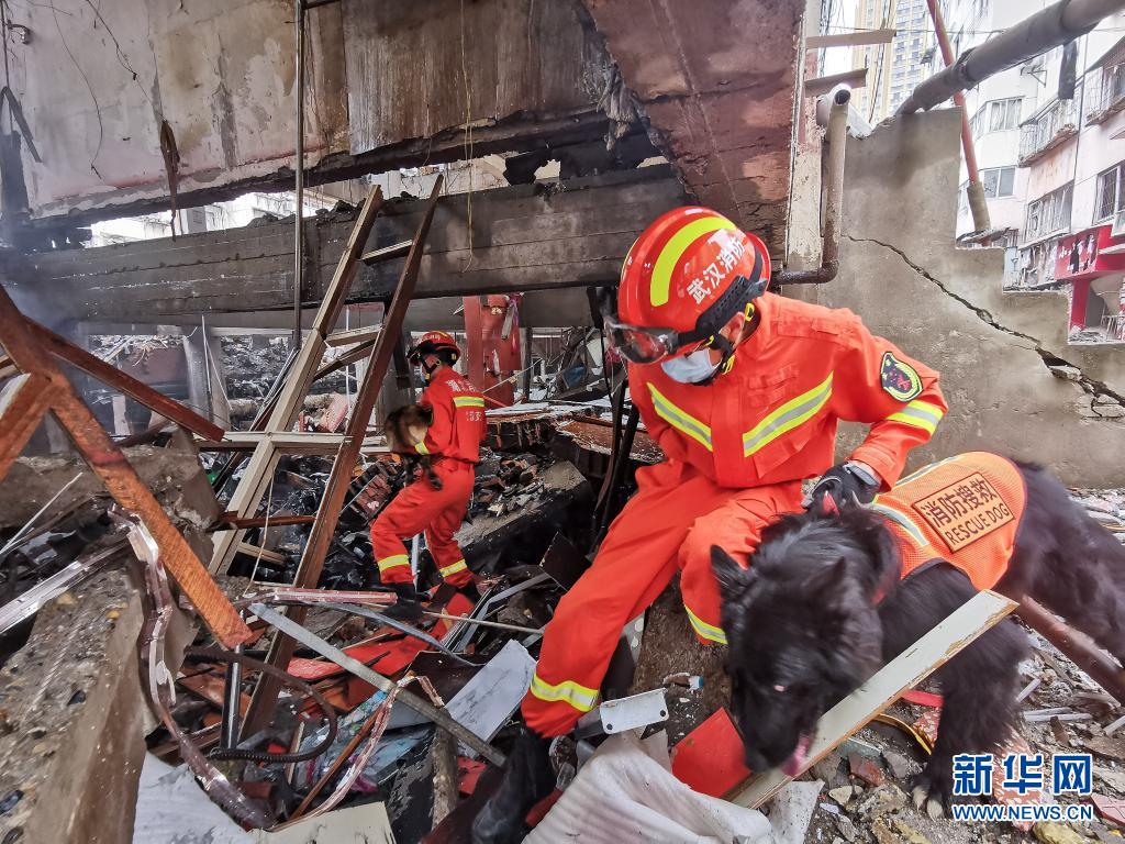 6月13日6时40分许,湖北十堰市张湾区艳湖社区集贸市场发生燃气爆炸。这是消防救援人员和搜救犬在现场搜救(6月13日摄)。