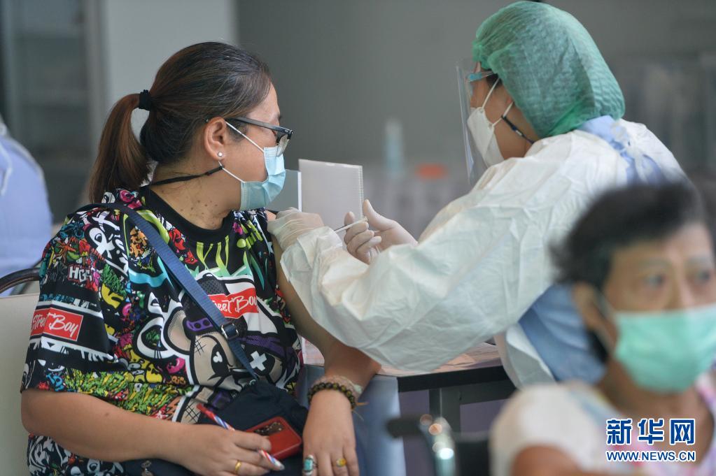 6月19日,一名女子在泰国北榄府一处新冠疫苗接种点接种疫苗。