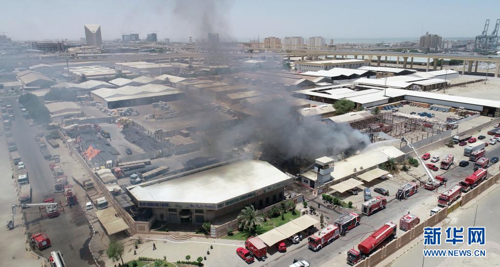 这是6月19日在科威特首都省拍摄的一处起火的仓库(无人机照片)。