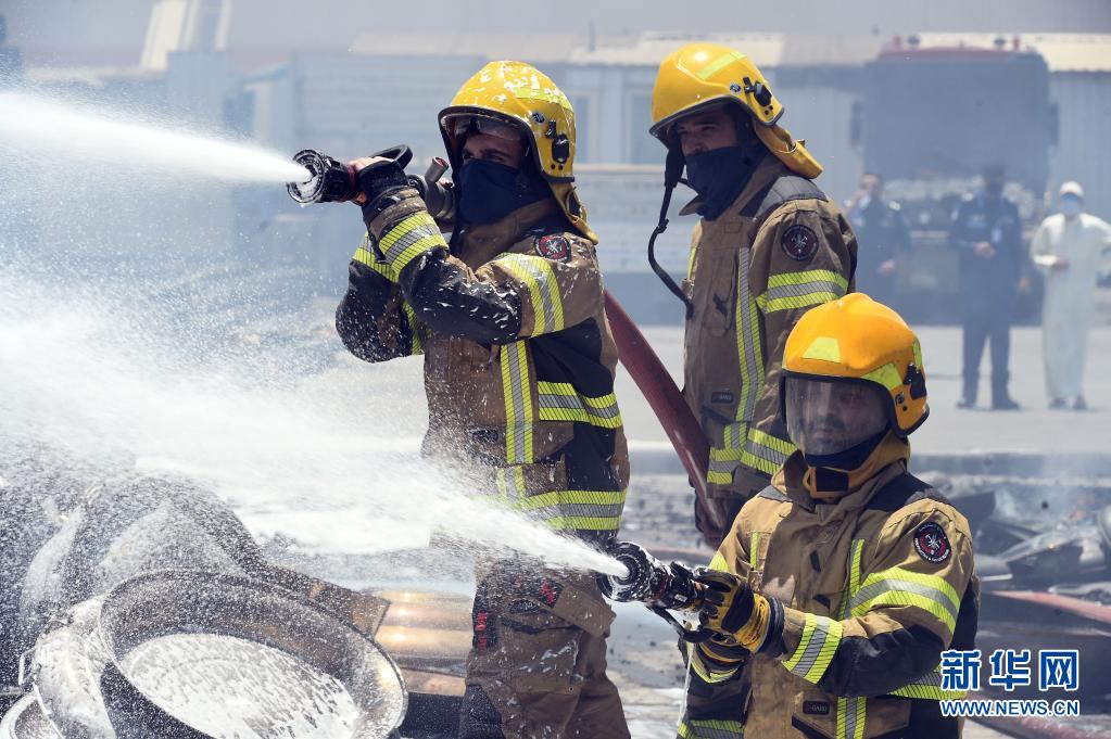 6月19日,消防人员在科威特首都省一处仓库火灾现场灭火。