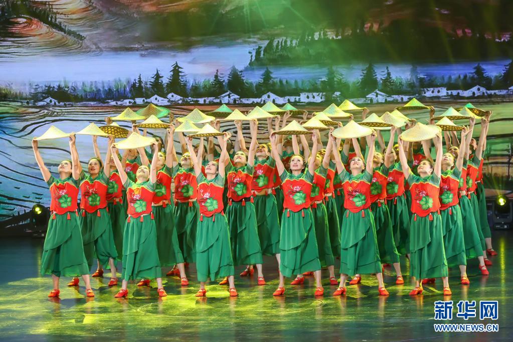 6月19日,闵行区浦江镇文化体育事业发展中心舞蹈团队表演广场舞《田间斗笠》。
