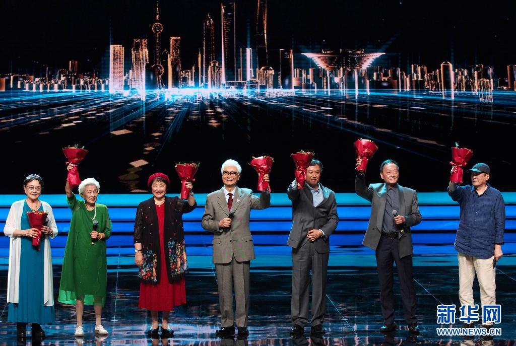 6月19日,电影艺术家王晓棠、谢芳、祝希娟、梁波罗、达式常、童自荣、郑大里(自左至右)在颁奖典礼上。