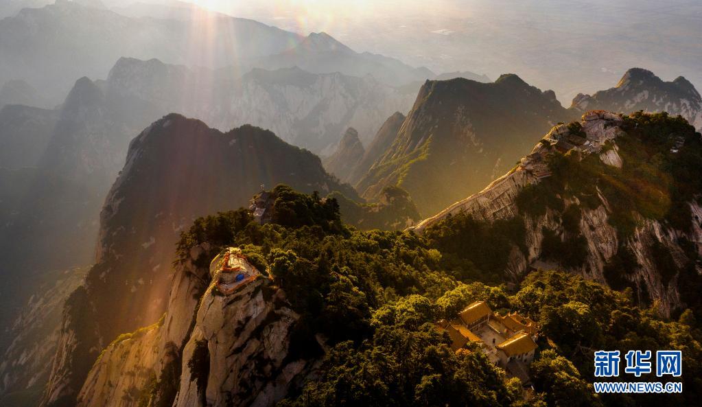 雨后初霁,位于陕西省华阴市的西岳华山在晚霞映照下,风光壮美。