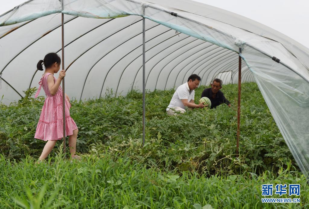 6月19日,郑加卫(中)在汪李村的家庭农场里走访,楚思扬在旁边玩耍。新华社记者 周牧 摄