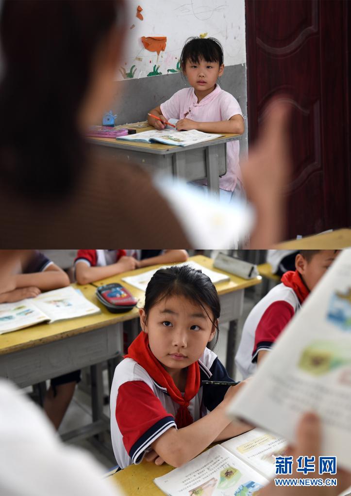 这张拼版照片上图为:2020年6月10日,楚思扬在汪李村的小学里上课(新华社记者 张端 摄);下图为:2021年6月18日,楚思扬在蒙城县仁和路小学上课(新华社记者 周牧 摄)。新华社发