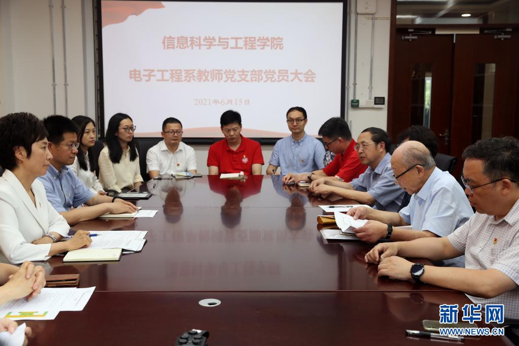 6月15日,在复旦大学信息科学与工程学院电子工程系教师党支部党员大会上,陈振新(右二)宣读自己的入党志愿书。