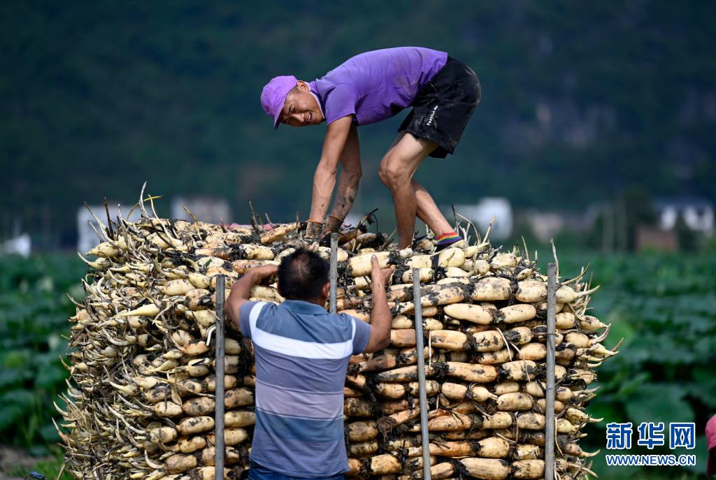 6月20日,在柳江区百朋镇怀洪村,农民转运刚采挖的莲藕。
