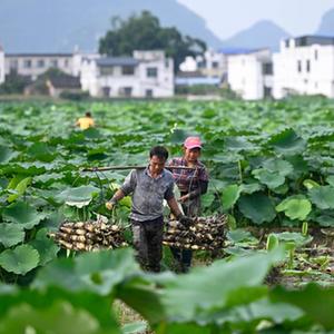 广西柳州市柳江区百朋镇万亩荷塘种植的春季莲藕迎来丰收。连日来,农民紧抓农时,抢收春藕、抢种夏藕,荷塘内一派繁忙景象。