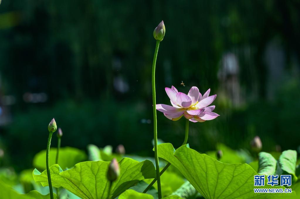 6月21日,蜜蜂飞舞在山东省青州市南阳河景区的荷塘里。