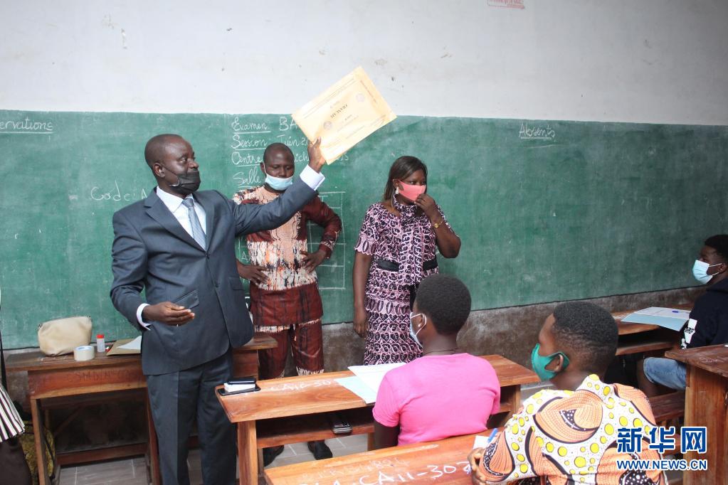 6月21日,一名监考员在贝宁维达一个大学入学考试考点展示考卷。新华社发(塞拉芬 摄)