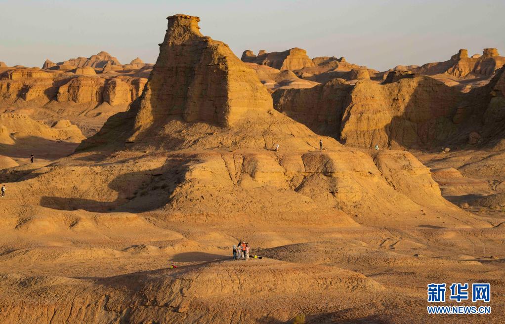 游客在新疆克拉玛依乌尔禾世界魔鬼城景区内拍照游玩(6月21日摄)。