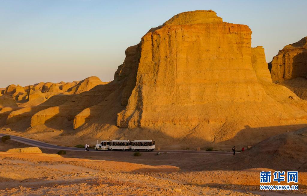 游客乘坐观光车在新疆克拉玛依乌尔禾世界魔鬼城景区内游玩(6月21日摄)。