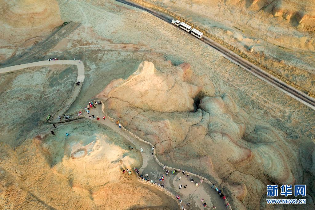 游客在新疆克拉玛依乌尔禾世界魔鬼城景区内拍照游玩(6月21日摄,无人机照片)。