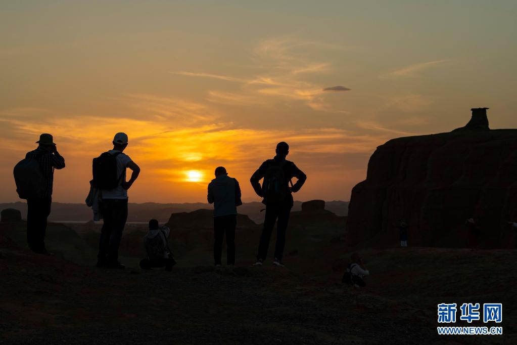 游客在新疆克拉玛依乌尔禾世界魔鬼城景区欣赏日落(6月21日摄)。