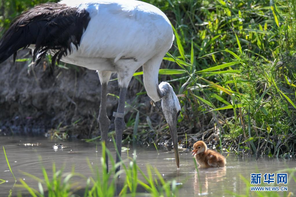 6月21日,成年丹顶鹤带领雏鹤在水中觅食。新华社记者 张楠 摄