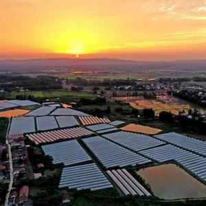 晚霞映衬下的安徽省全椒县六镇镇大张村金蝉芦笋种养基地(6月21日摄,无人机照片)。