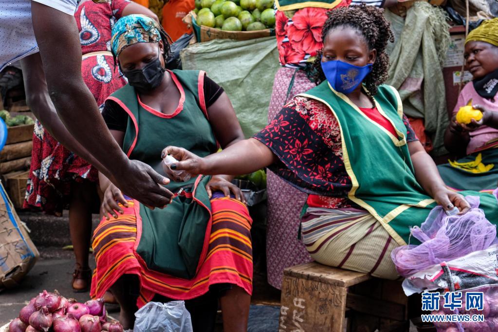 6月23日,商贩在乌干达坎帕拉的纳卡塞罗市场给顾客喷洒手部消毒液。