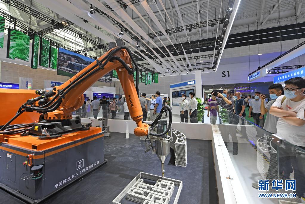 6月24日,在国家会展中心(天津)一期展馆,观众在参观中建八局展厅内的建筑3D打印机器人。