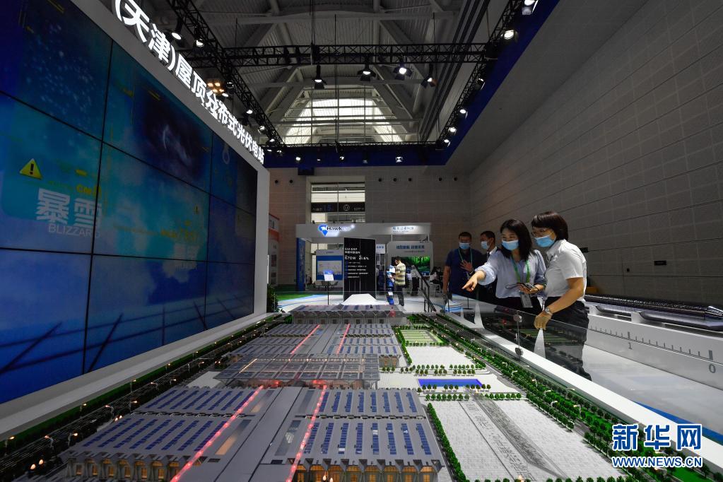 6月24日,观众在国家会展中心(天津)一期展馆内参观国家会展中心(天津)屋顶分布式光伏电站模型。