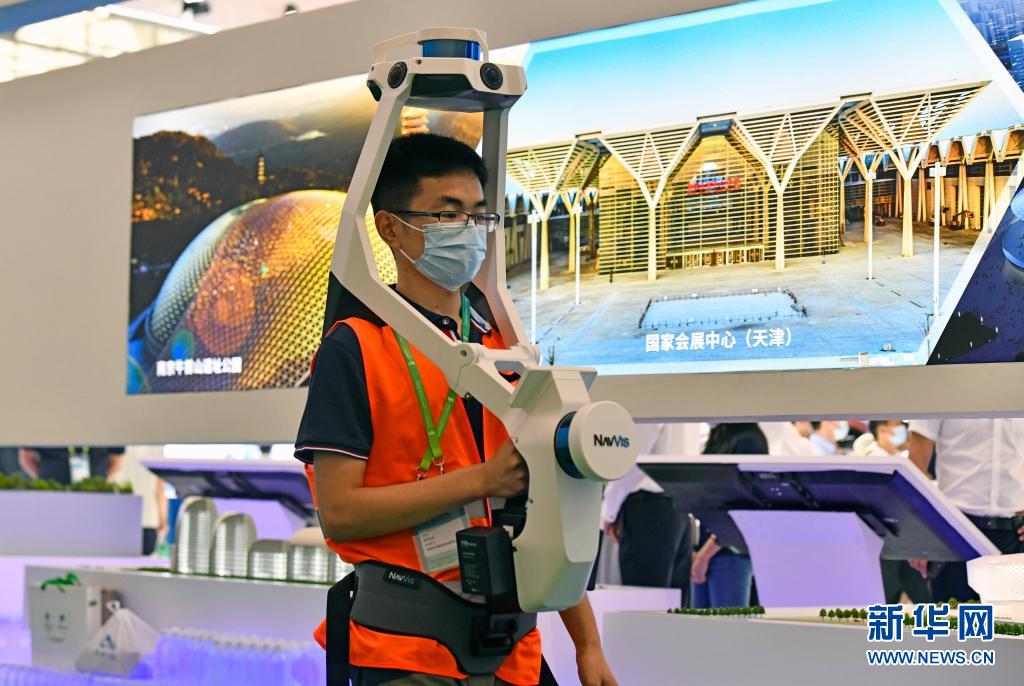 6月24日,在国家会展中心(天津)一期展馆,参展企业工作人员在展示智能测绘设备。