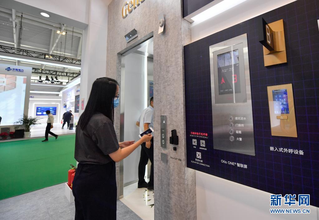 6月24日,在国家会展中心(天津)一期展馆,工作人员操作演示无接触式智能化电梯。