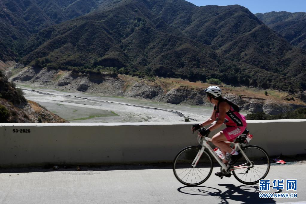 6月24日,一名女子骑车经过美国加利福尼亚州洛杉矶县阿祖萨市附近的圣加布里埃尔水库。