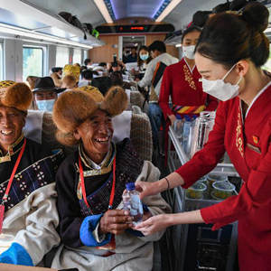 列车员向乘坐首趟复兴号高原内电双源动车组的乘客递水(6月25日摄)。