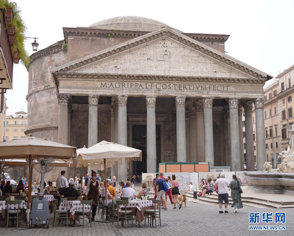 6月24日,人们在意大利罗马万神殿前一家餐馆的户外区域消费。