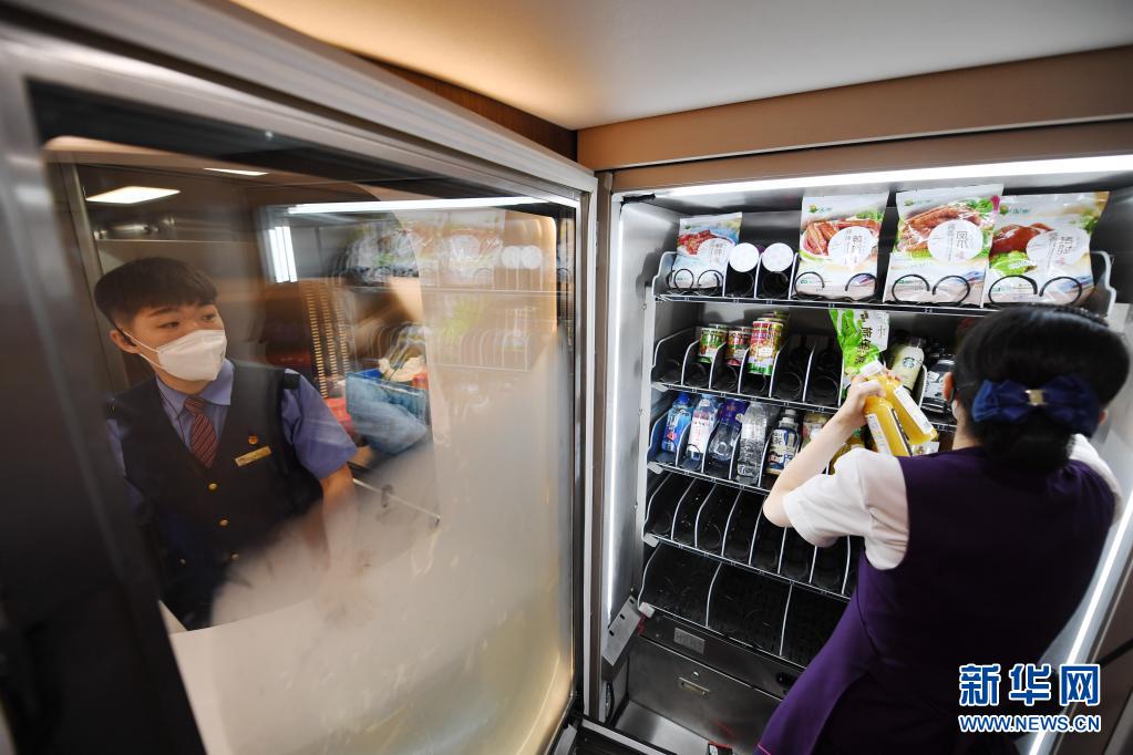 6月25日,工作人员在复兴号智能动车组G5次列车发车前为车上的自动贩卖机补充商品。