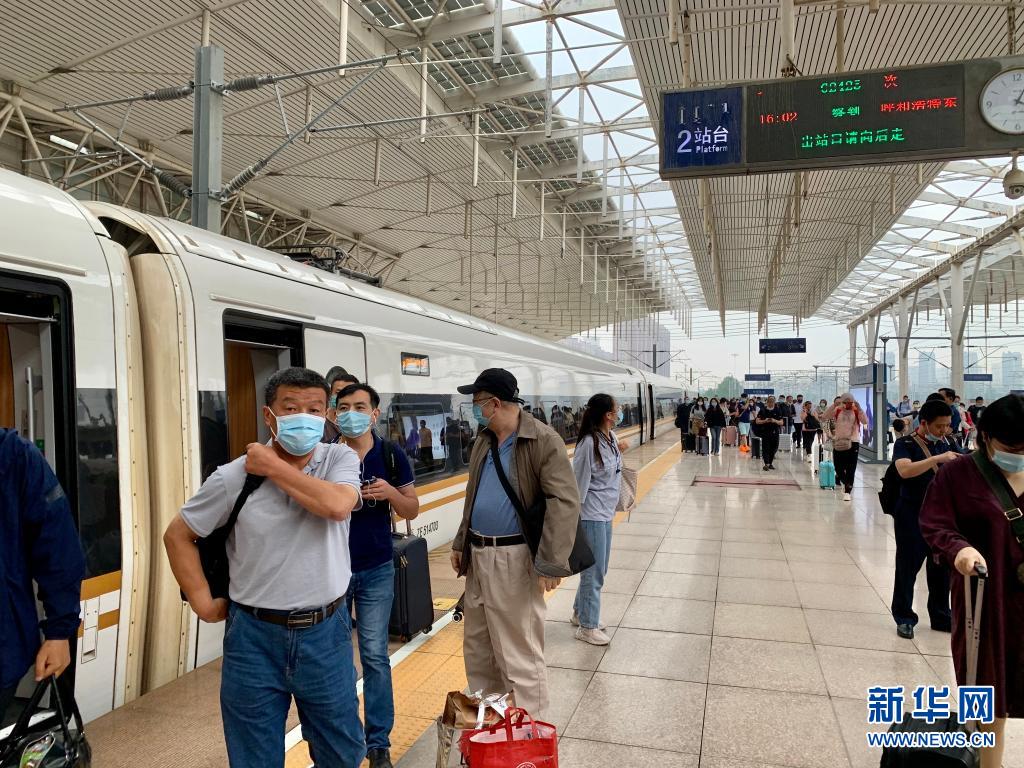 6月24日,由北京北站开往呼和浩特东站的G2425次“复兴号”动车组列车停靠在呼和浩特东站,旅客有序下车(手机拍摄)。新华社记者 朱文哲 摄