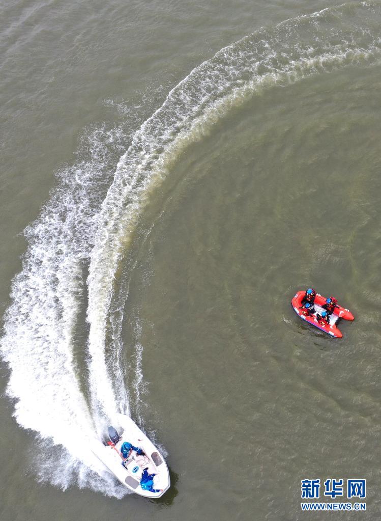 6月25日,参加防汛救援综合实战演练人员在进行翻船自救演练(无人机照片)。