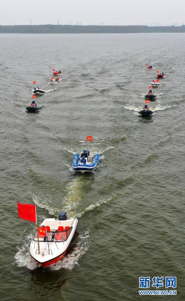 6月25日,参加防汛救援综合实战演练人员在进行冲锋舟水上编队搜索演练(无人机照片)。