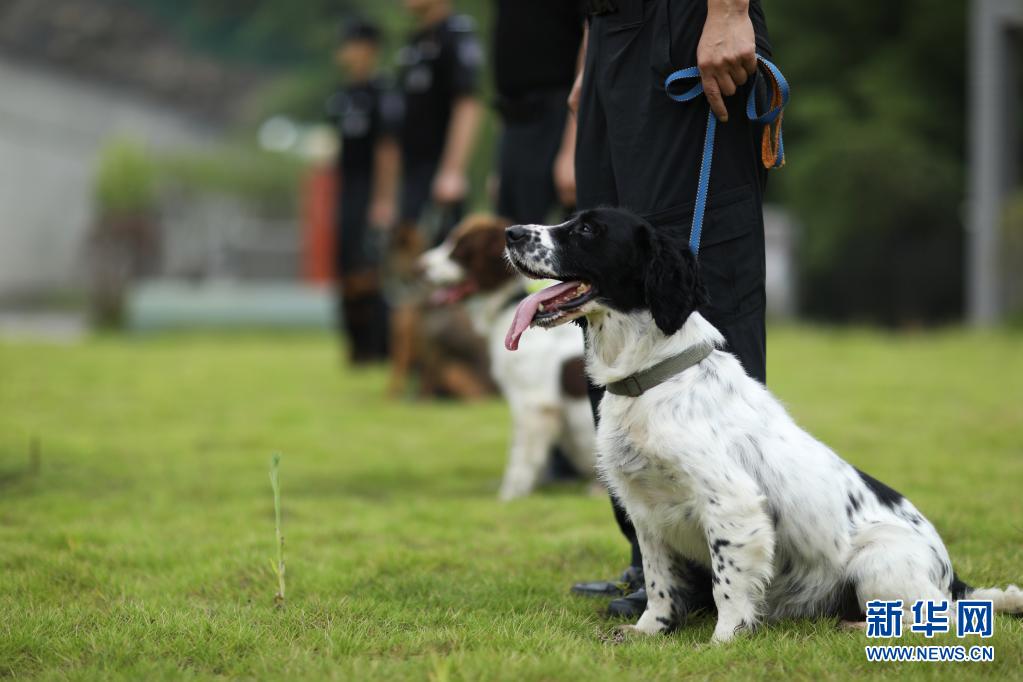 6月25日,在赤水市公安局警犬训练基地,陈利强与战友对警犬进行训练。