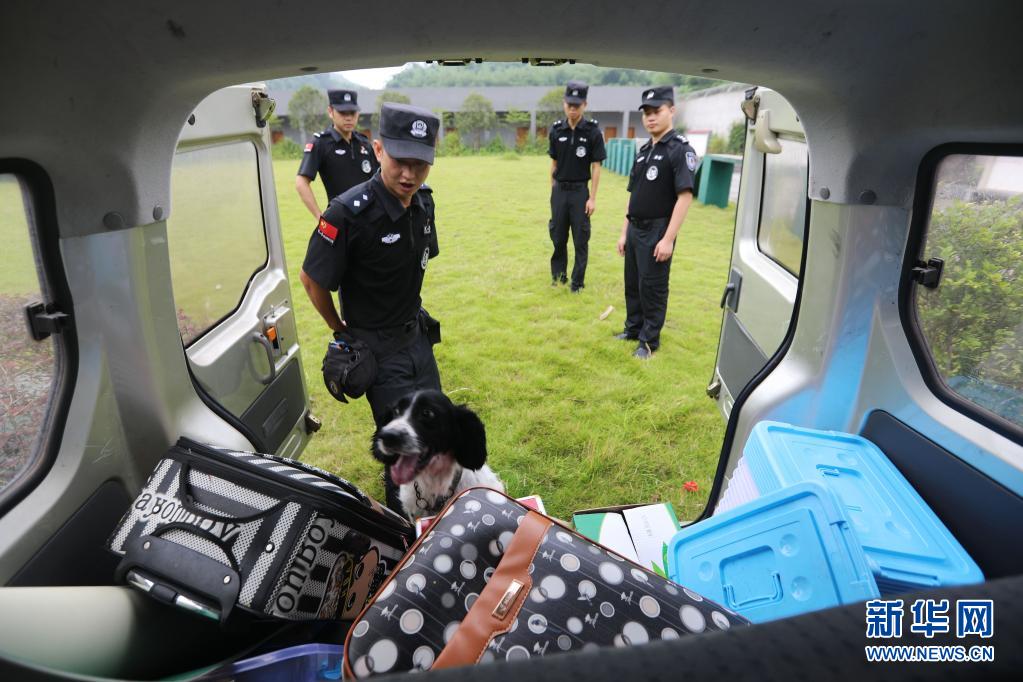 6月25日,在赤水市公安局警犬训练基地,陈利强带着缉毒犬“罗特”开展车辆模拟嗅毒搜查。
