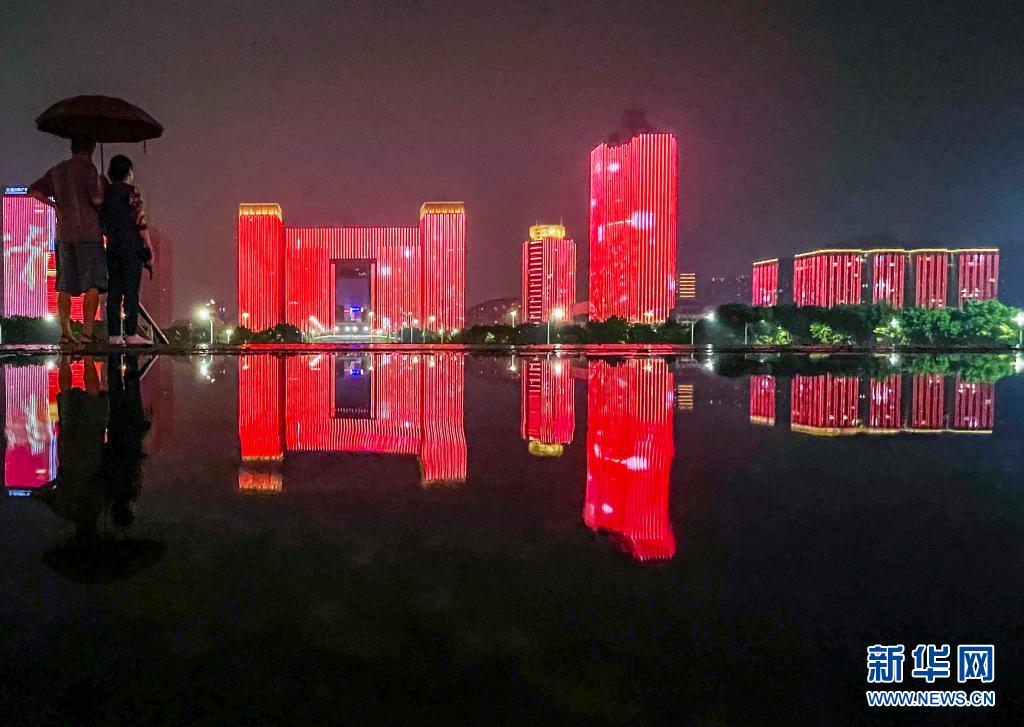 近日,庆祝建党百年主题灯光秀在江苏省南京市新街口商圈、河西新城中轴线等地陆续上演。