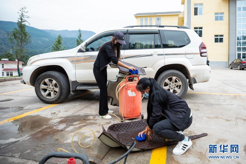 在四川省凉山彝族自治州昭觉县,社区戒毒康复人员在洗车(6月22日摄)。昭觉县为社区戒毒康复人员提供多种技能培训机会,以帮助他们在戒毒康复期间学习技术技能,待成功戒断毒瘾后重新走入社会就业。新华社记者 沈伯韩 摄