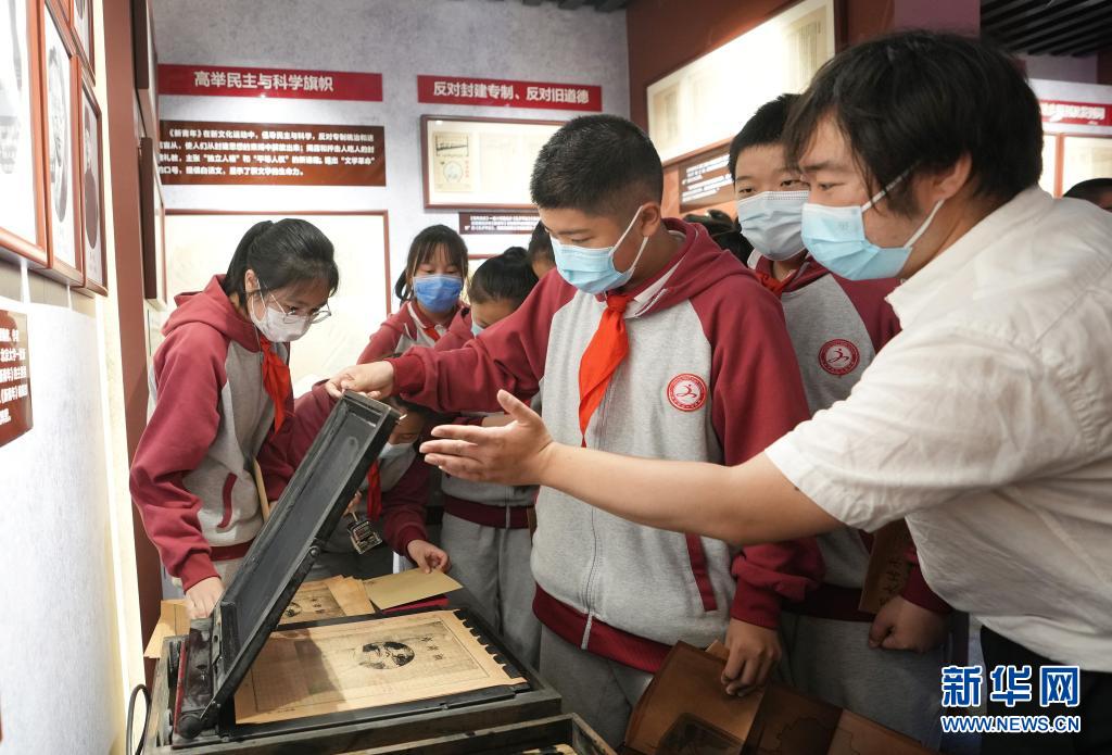 6月1日,北京市第二十七中学学生在《新青年》编辑部旧址(陈独秀旧居)了解展出的油印机。新华社记者 鞠焕宗 摄