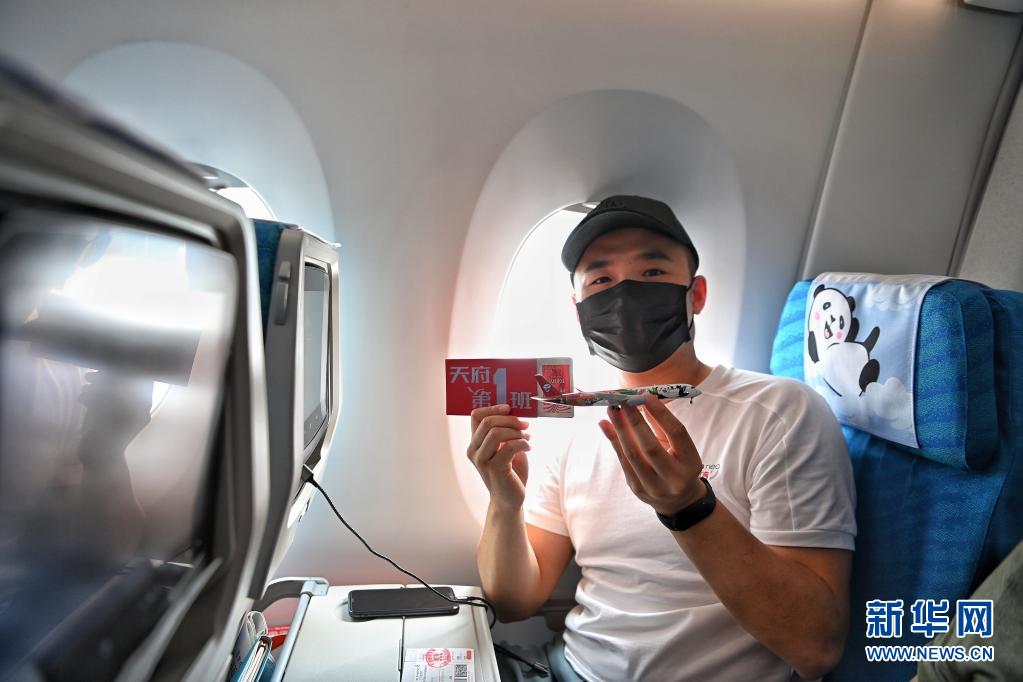 6月27日,在成都天府国际机场,搭乘四川航空公司3U8001航班的旅客展示首航纪念飞机模型和登机牌。