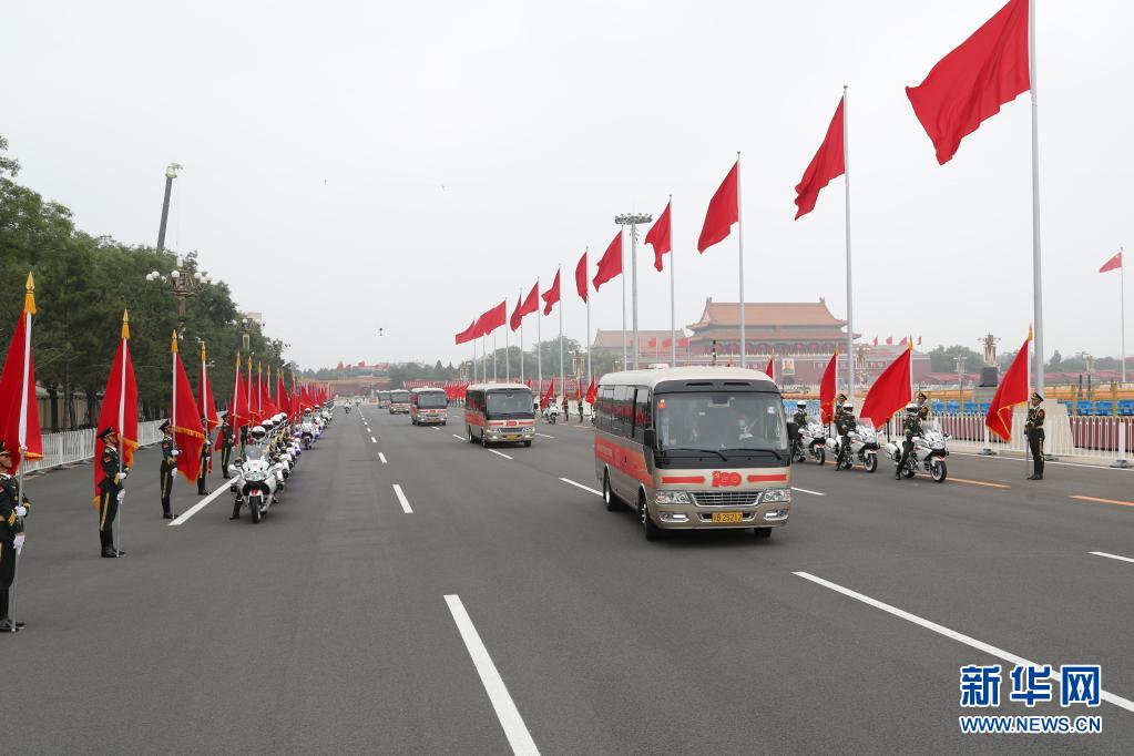 这是“七一勋章”获得者集体乘坐礼宾车从住地出发,由国宾护卫队护卫前往人民大会堂。