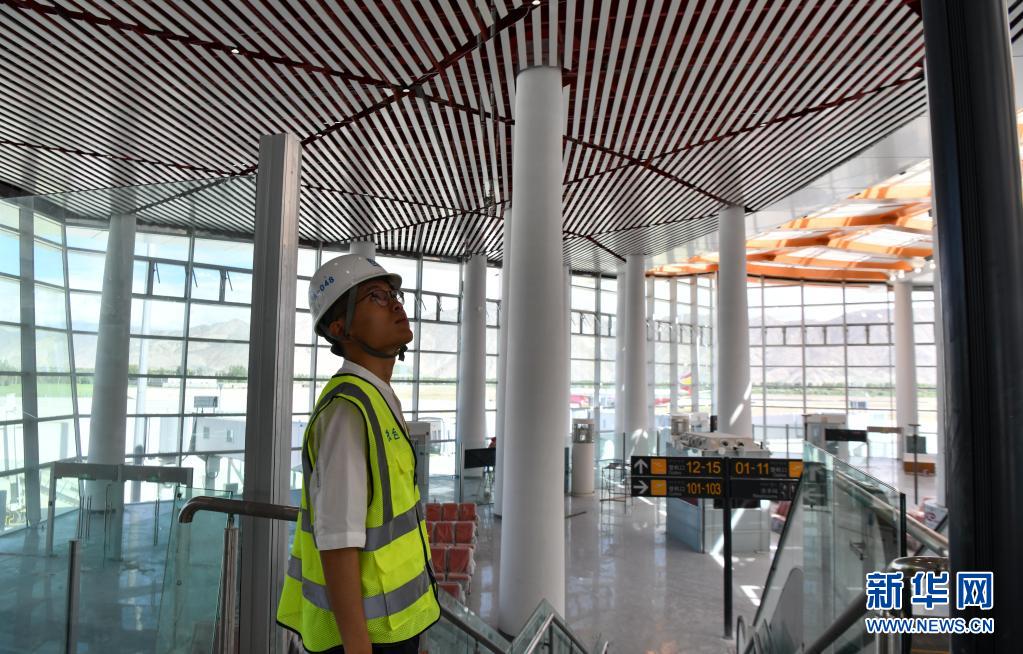 6月30日,施工人员在拉萨贡嘎国际机场T3航站楼内查看工程细节。