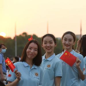 7月1日,庆祝中国共产党成立100周年大会将在北京天安门广场隆重举行。这是清晨,几名观众在日出时合影。