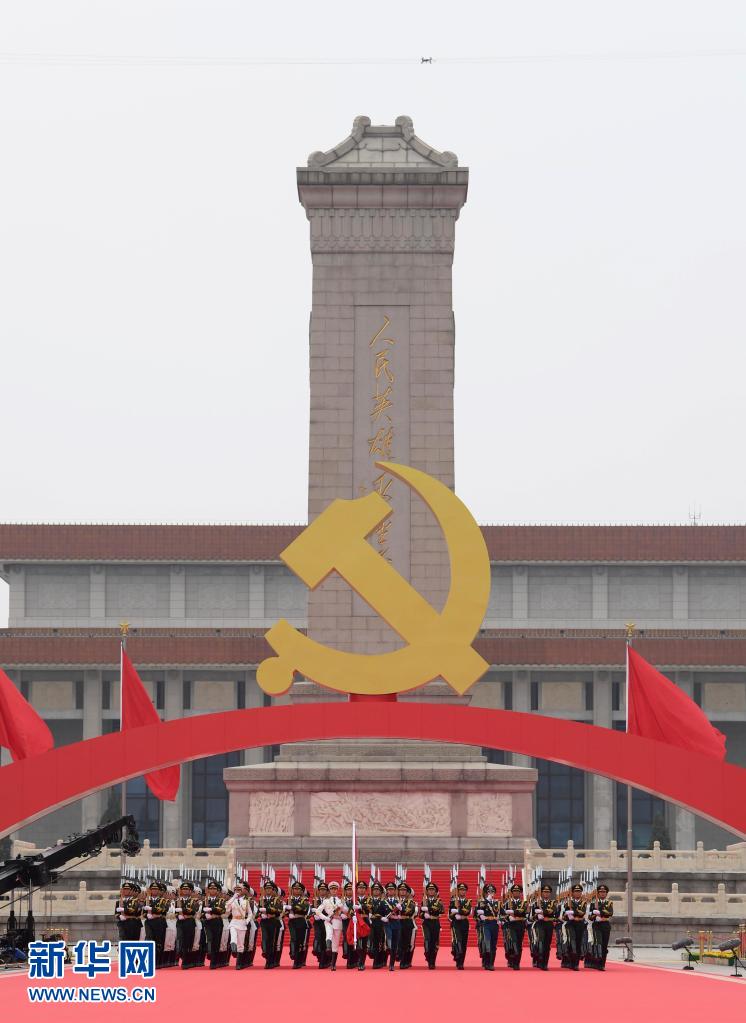 7月1日上午,庆祝中国共产党成立100周年大会在北京天安门广场隆重举行。这是国旗护卫队准备升旗。