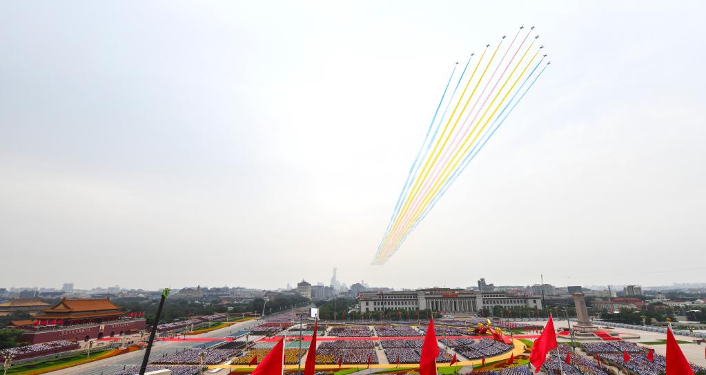 7月1日上午,庆祝中国共产党成立100周年大会在北京天安门广场隆重举行。这是大会开始前的飞行庆祝表演。