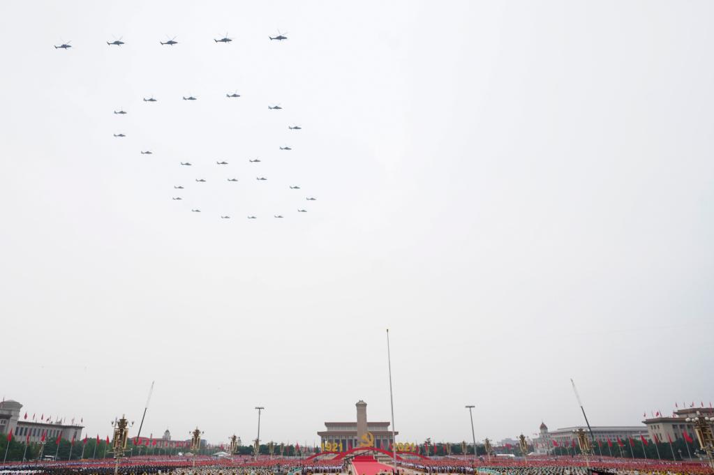 7月1日上午,庆祝中国共产党成立100周年大会在北京天安门广场隆重举行。这是大会开始前的飞行庆祝表演。