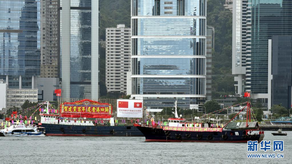 7月1日,悬挂国旗、区旗的渔船在维港巡游。新华社记者 卢炳辉 摄